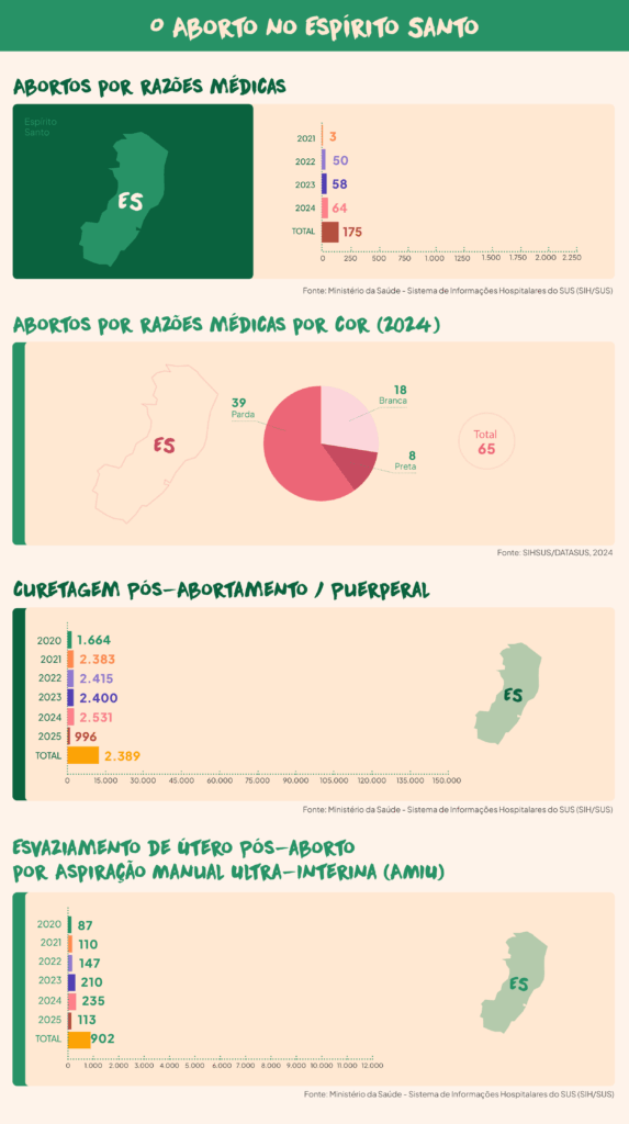 Com 175 abortos legais registrados entre 2021 e 2024, o Espírito Santo apresenta os menores números do Sudeste. Em 2024, 72% desses procedimentos foram realizados em mulheres negras. Segundo o Mapa do Aborto Legal, o estado é o que menos conta com serviços na região, tendo apenas sete cadastrados para a realização do procedimento. Destes, somente dois possuem mais de um nível de confirmação (federal e local).