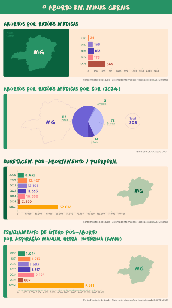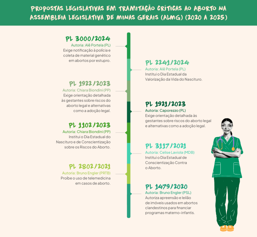 Entre 2020 e 2025, a Assembleia Legislativa de Minas Gerais (ALMG) promoveu a tramitação de propostas legislativas contrárias ao aborto com temas como riscos psicológicos, defesa da vida intrauterina e crítica à atuação institucional em casos de aborto.