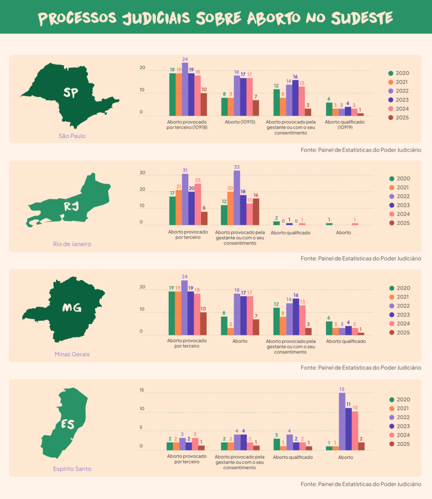 Além do risco à saúde, mulheres que interrompem uma gestação em situações não previstas na legislação brasileira — ou até devido à dificuldade de acessar um aborto legal — também lidam com a insegurança jurídica. Entre 2020 e junho de 2025, 4.291 processos judiciais relacionados ao aborto foram registrados na região Sudeste, cerca de dois por dia (em média), segundo o Painel de Estatísticas do Poder Judiciário.