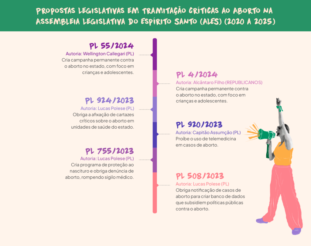 No Legislativo estadual do Espírito Santo, o tema aborto é recorrente. A Assembleia Legislativa do Espírito Santo (ALES) recebeu, entre 2020 e 2025, diversas propostas com foco na regulação e restrição do aborto. A maioria dos projetos ainda em tramitação é assinada por parlamentares do Partido Liberal (PL), sendo o deputado estadual Lucas Polese (PL) autor de três das propostas.