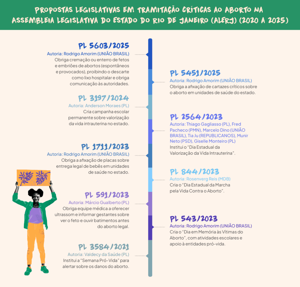 Dentre as propostas legislativas contrárias ao aborto que passaram pela Assembleia Legislativa do Estado do Rio de Janeiro (ALERJ) entre 2020 e 2025 destaca-se a autoria por parlamentares de partidos conservadores (como UNIÃO BRASIL, PL e REPUBLICANOS). O deputado estadual Rodrigo Amorim (UNIÃO BRASIL), autor de quatro das propostas em tramitação.